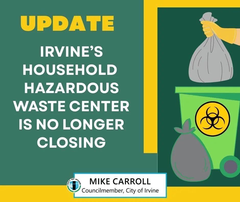 Thank you to everyone who reached out to my office about the Household Hazardous Waste Collection Center. The Irvine City Council unanimously approved my motion to keep the Center from closing! This facility is of great use to our community, where residents dispose of hazardous items such as aerosols, batteries, electronics, paint, and more. It's essential for residents to have easy and safe access to a place for disposing of dangerous common items. To watch my statement about the importance of the Household Hazardous Waste Collection Center, click here.